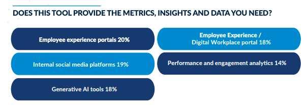 Internal respondents said that metrics with origins in generative AI platforms (18%), internal social media platforms (19%), and employee experience portals (20%) were least able to provide useful and needed comms data. On the other side of the coin, survey respondents claimed that employee surveys and the metrics from newsletter software were the easiest to understand.